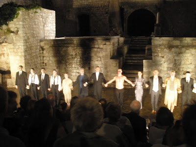 In the park of Art School Luka Sorkočević last night I watched Oedipus the King by Sophocles. Due to its oral tradition there are many different versions of the legend of Oedipus. Significant variations on the legend of Oedipus are mentioned in fragments by several ancient Greek poets including Homer, Hesiod, Pindar, Aeschylus and Euripides. The most popular version of the legend comes from the set of Sophocles. Horrible tragedy that can't leave anyone indifferent. I am not a critic, my opinion is not professional, but as a regular spectator I can say that I experienced this play so deep like I was a part of the story. Such a feeling you can have only if you are in front of good actors. Last night they carried us through the story like through the live. All praise to the actors.